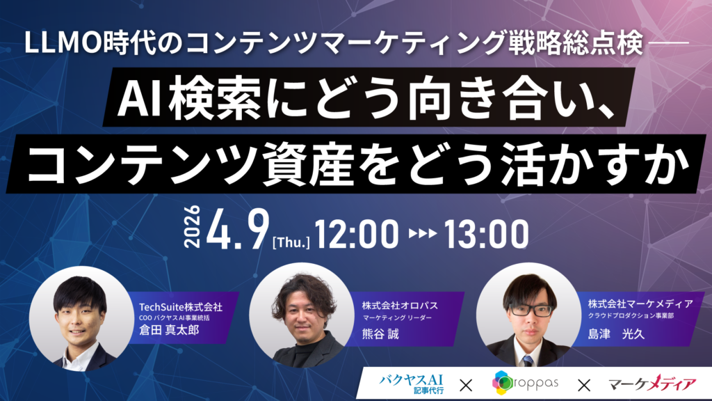 【4月9日開催】LLMO時代のコンテンツマーケティング戦略総点検——AI検索にどう向き合い、コンテンツ資産をどう活かすか主催:TechSuite株式会社 |