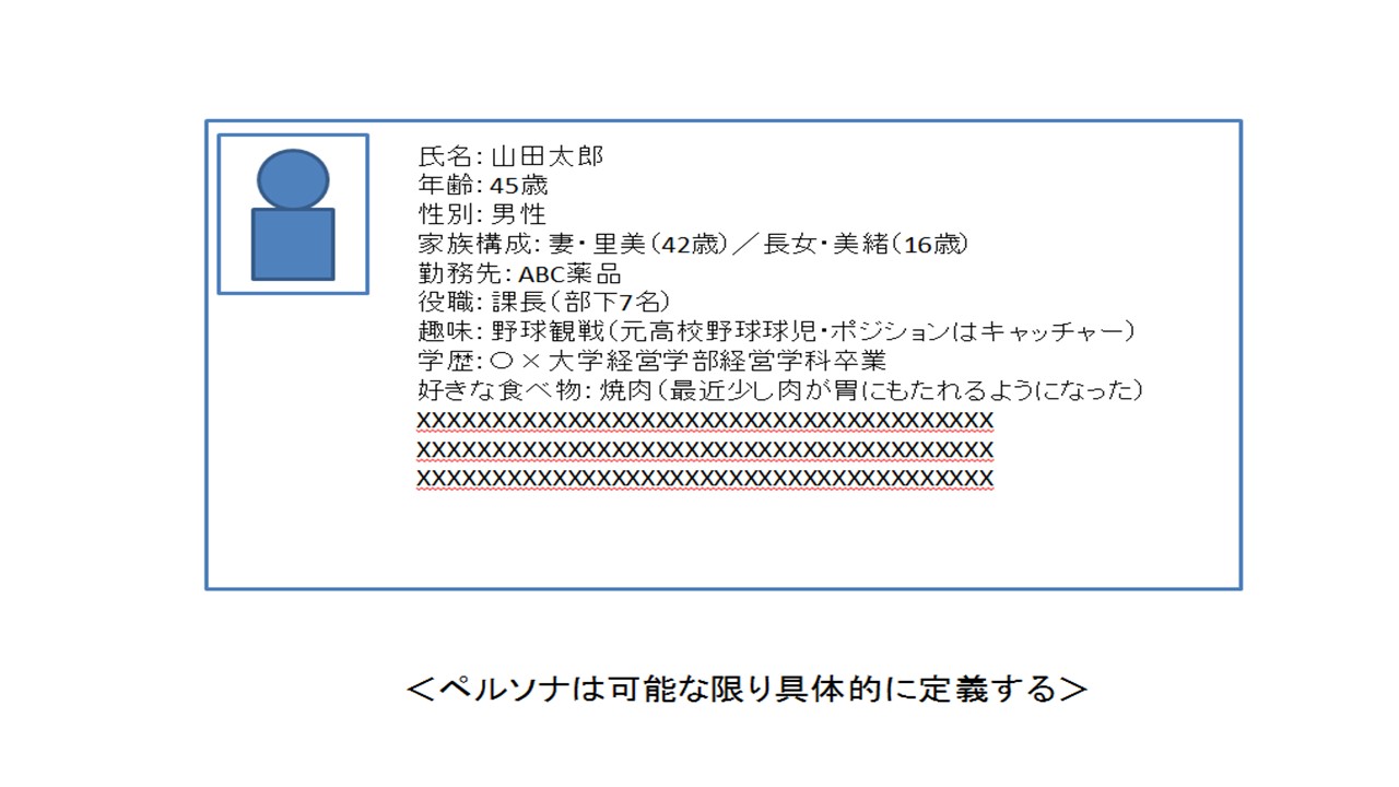 まず、ペルソナは可能な限り具体的に定義しましょう。「35歳、男性、会社員」……といった漠然としたイメージだけでは、ペルソナとしては使えません。氏名、年齢、性別、生年月日、趣味、家族構成、勤務先、年収、学歴から、必要なら飼っているペットの種類や名前まで、可能な限り詳しく属性を定義し、あたかも実在する人物であるかのように具体化するのがポイントです。