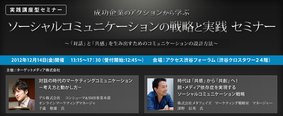 講師には、デル株式会社のPC販売マーケティングを担う千歳氏と、常盤薬品工業をはじめとする数多くの共感・共創のためのコンテンツ実績を誇る株式会社メタフェイズ 深野氏を招いて、実践するためのソーシャルコミュニケーション戦略をご紹介する。