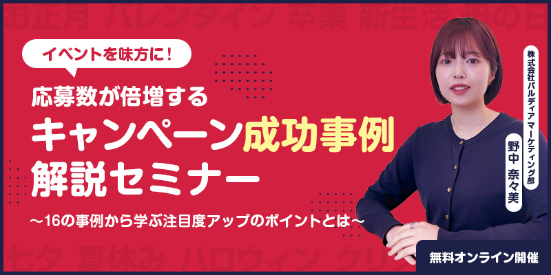 イベントを味方に!応募数が倍増するキャンペーン成功事例解説セミナー|16の事例をご紹介(1/15) 主催:株式会社パルディア |