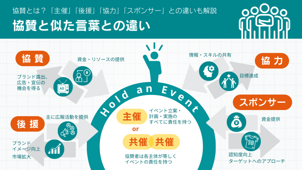 協賛とは、イベントへの関わり方という点で「主催」とは大きく違います。