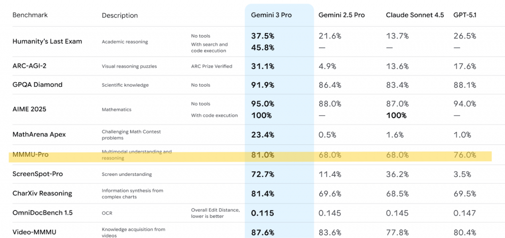 Geminiは、Googleがこれまでに培ってきた検索エンジンデータをフル活用して理解・分析を行うため、非常に高い言語処理能力を有しています。AIモデルの知識と推論能力を評価し、総合力を測るベンチマーク「MMLU Pro」においても、Gemini 3は他社の追随を許しません。