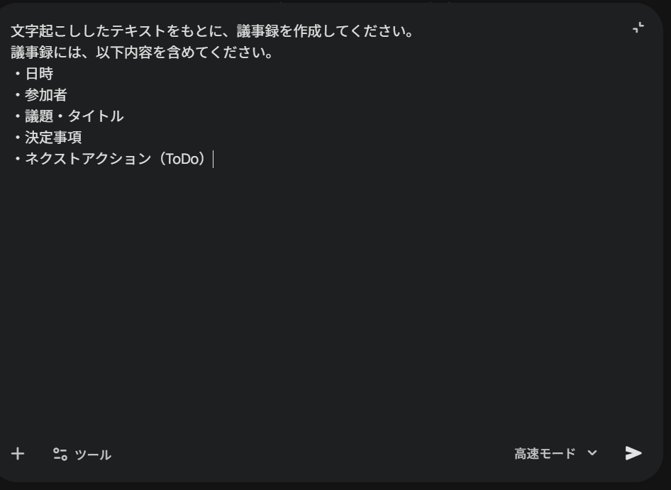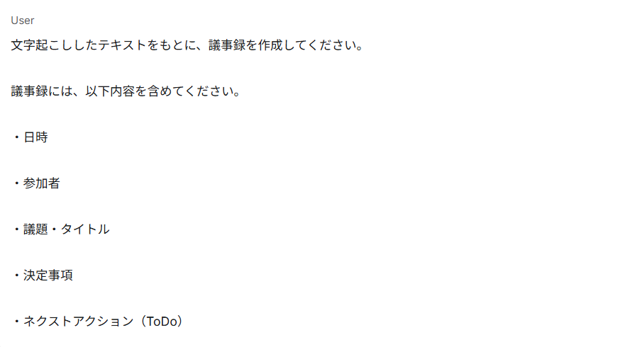 あらかじめ議事録に含めたい項目や、「日時」「参加者」「議題・タイトル」など追加で入れたい項目がある場合は、それらもプロンプトに明記することが重要です。