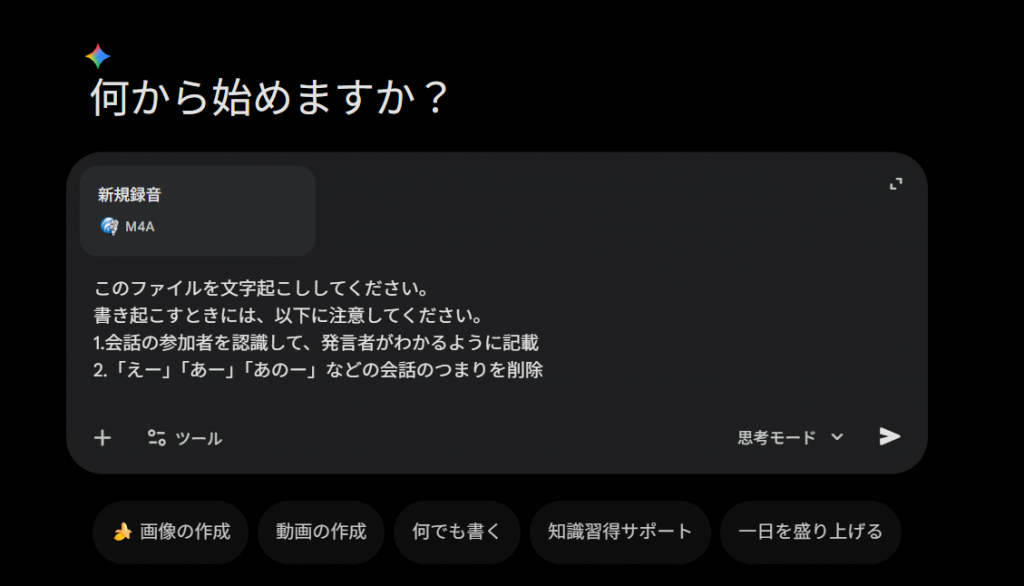 音声ファイルをアップロードできたら、Geminiのチャット欄に以下の画像のようにプロンプトを入力します。