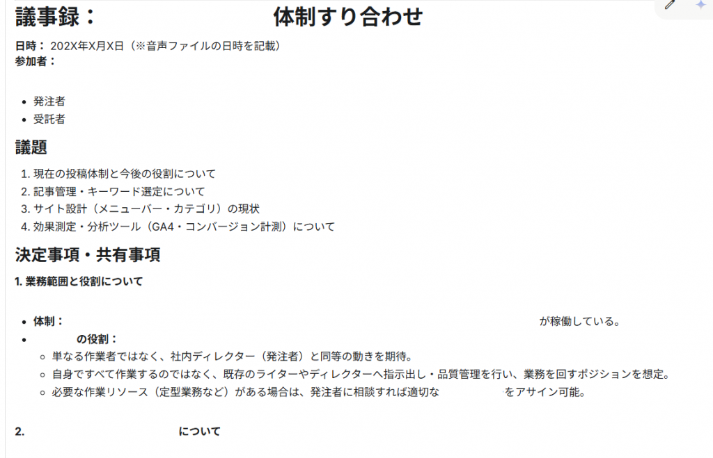 このように、項目や構成を意識して指示を出すことで、議事録作成の精度と効率は大きく向上し、生成された文章もそのまま業務に活用しやすくなります。