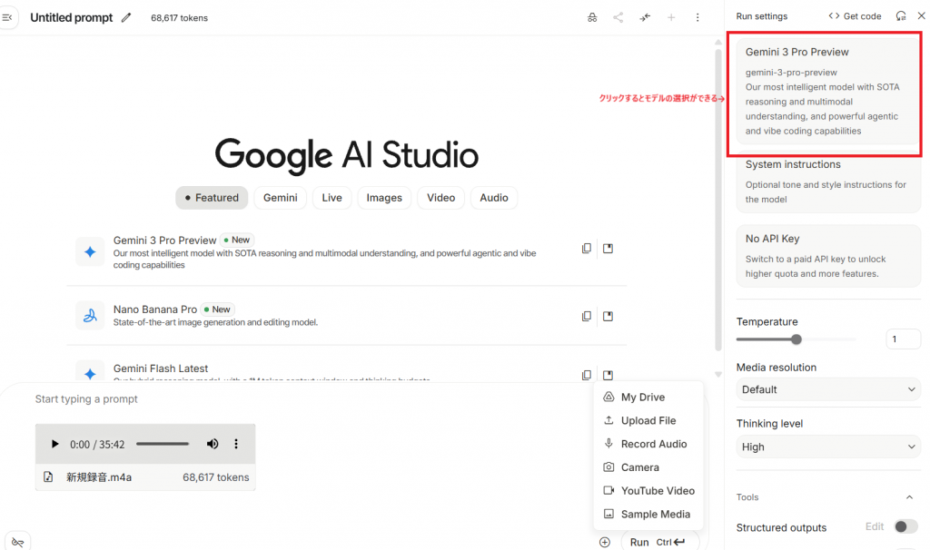 必ず、Gemini 2.5 ProやGemini 3 Proといった、音声や長文テキストの処理に対応したモデルを選択してください。