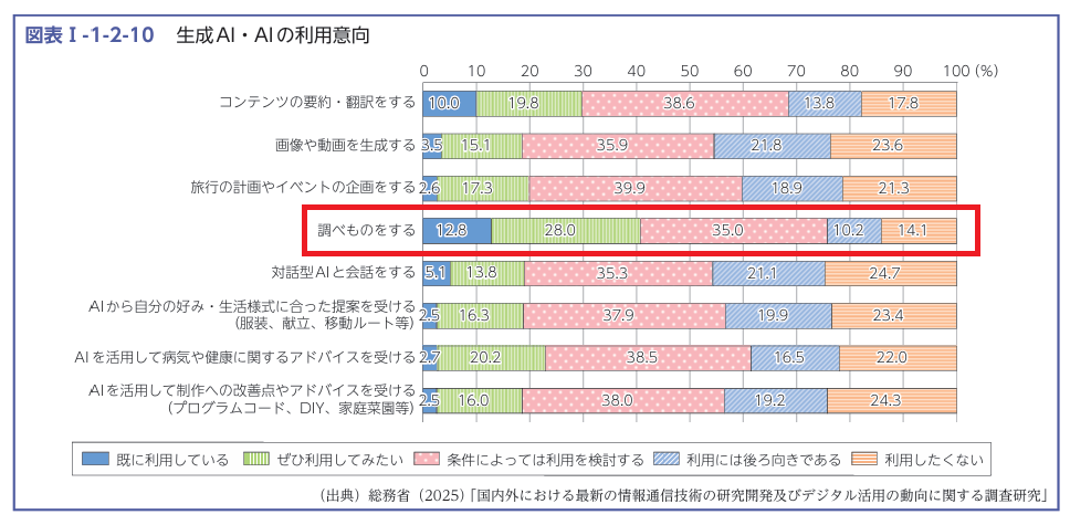 LLMOという概念が生まれた背景には、生成AIの爆発的な普及と、それに伴うユーザーの検索行動の変化があります。総務省の情報通信白書(令和7年版)によれば、情報収集手段にAIを利用することに対して、約8割が前向きであるという結果が出ています。