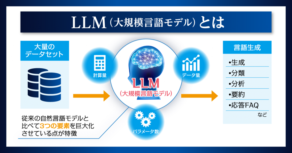 LLM(Large Language Model)は、計算量・データ量・パラメータ量の3要素を従来よりも巨大化させたことで、さらに高精度なアウトプットを可能にしたAIモデルです。膨大なデータを学習したことで、人間のように自然言語を理解することが可能となっています。