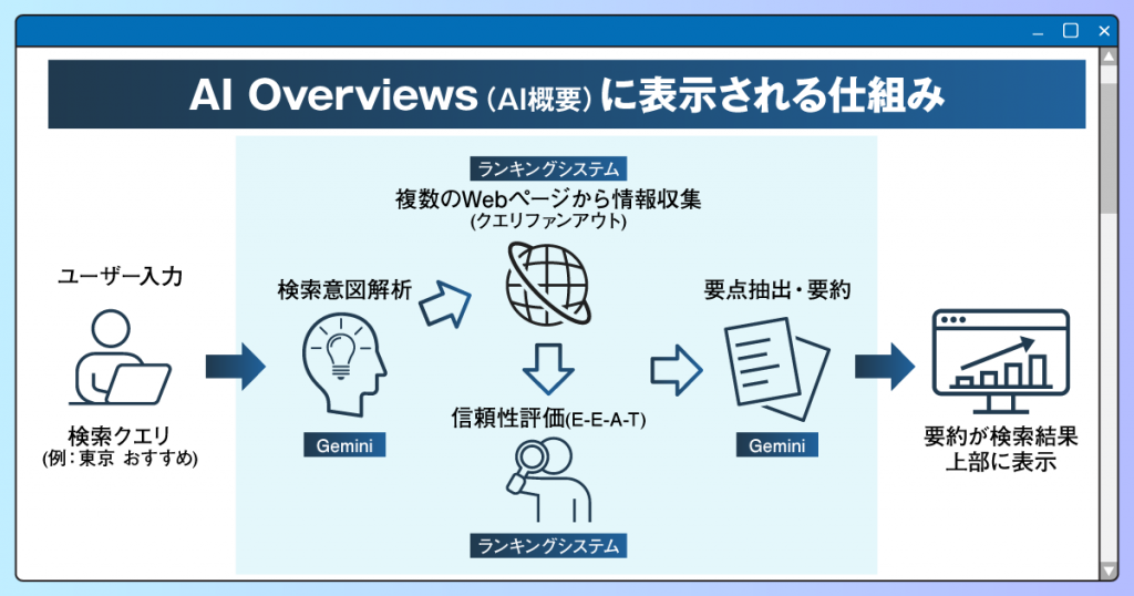 AI Overviewsがどのようなプロセスを経て回答を生成しているのか、その裏側にある仕組みを理解しておきましょう。