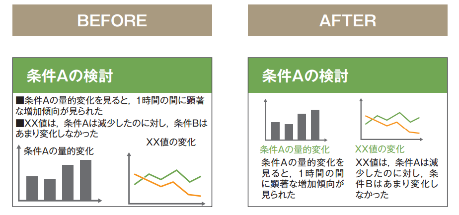 - グラフや図を使って、売上や顧客満足度の推移をわかりやすく表現する。