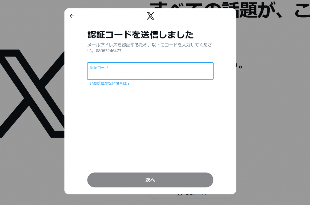 入力内容を送信すると、登録した電話番号宛にSMSで認証コードが届きます。表示された入力欄に認証コードを入力し、本人確認を完了させましょう。