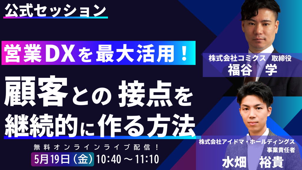 | 5日目 5/19(金) 営業DX系セミナー 10:20-10:32 特別セッション:SNS戦略に関してアナタの質問に回答します⑤ 10:40-11:10 顧客満足度を得るには提案前の価値提供が大切 11:20-11:50 数よりも質!決定率が一番高い「紹介」獲得を仕組み化する方法 11:50-12:00 AIは営業マンの秘書になれるのか?営業経験0が営業戦略立ててみた 12:00-12:30 営業の新しい当たり前!?人口減少時代のリモートセールスチームとは? 12:40-13:10 Coming Soon 13:20-13:32 今すぐ実践!最新版「ビジネスセミナー集客のポイント」⑤ | |