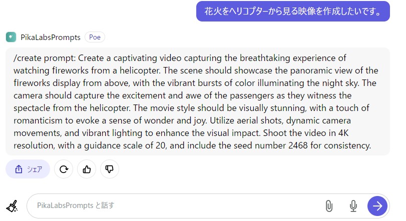 Pikaでは、作成された動画のプロンプトを表示することができます。動画の下の文章がプロンプトです。