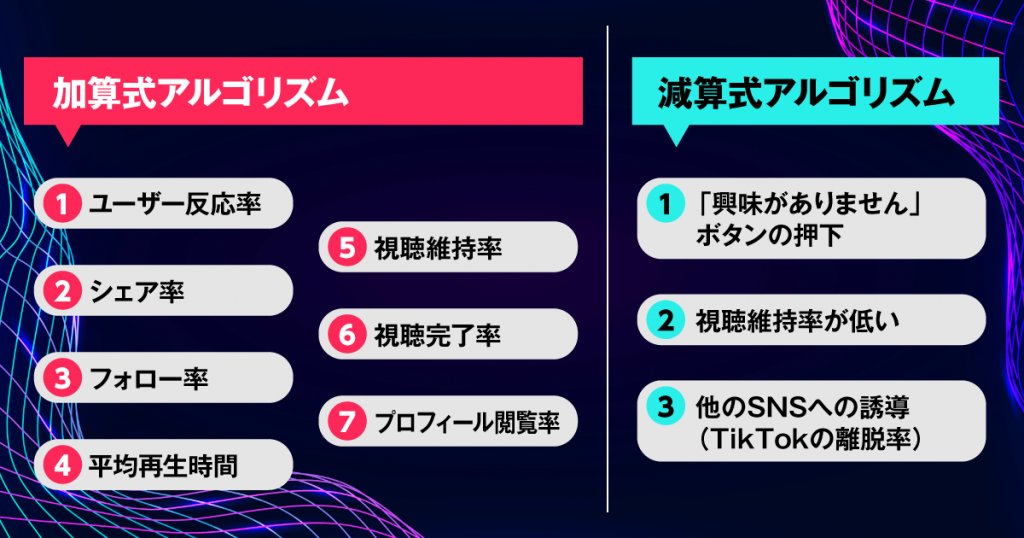 TikTokのアルゴリズムは、大きく分けて「加算式アルゴリズム」と「減算式アルゴリズム」の2種類で構成されています。これらに含まれる各指標でコンテンツの質を評価し、動画の良し悪しを総合的に判定します。